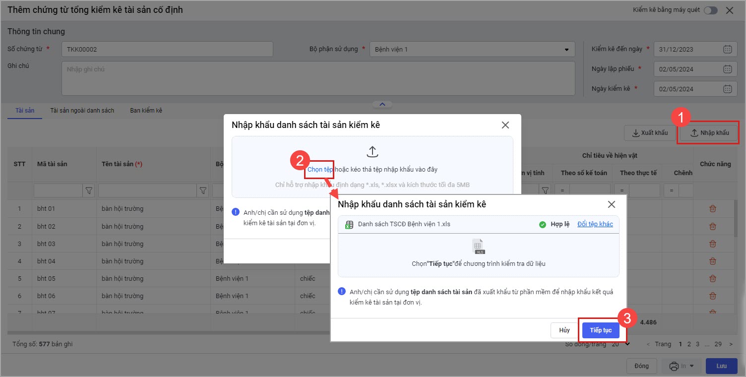 • Anh/chị thực hiện Nhập khẩu kết quả tổng kiểm kê thực tế của đơn vị vào phần mềm . Anh/chị chọn Nhập khẩu, chọn tệp tải lên sau đó chọn Tiếp tục.