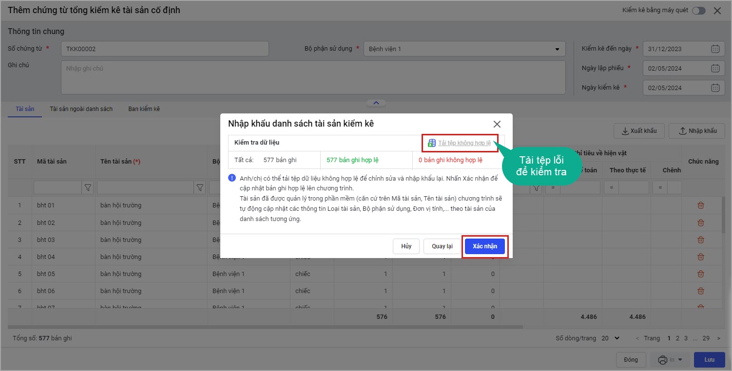 • Trường hợp có tệp lỗi anh/chị chọn Tải tệp không hợp lệ để kiểm tra nguyên nhân và sửa lỗi. Sau khi không còn bản lỗi nữa, anh/chị chọn Xác nhận để hoàn thành việc nhập khẩu.