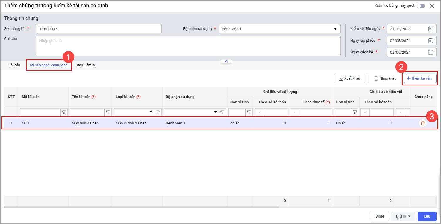 • Trường hợp khi kiểm tra thực tế tại đơn vị phát hiện có tài sản nằm ngoài danh sách tổng kiểm kê, để bổ sung vào chứng từ anh/chị chọn tab Tài sản ngoài danh sách(*) chọn Thêm tài sản, sau đó bổ sung thông tin tài sản.