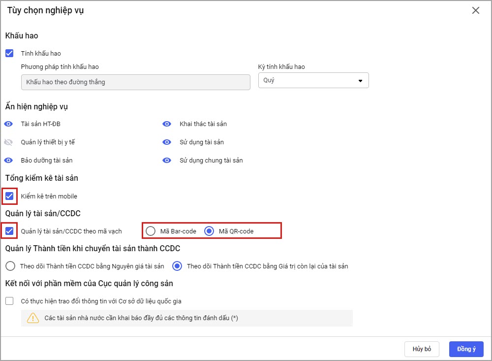 2. Tích chọn Kiểm kê trên mobile và tích chọn Quản lý tài sản/CCDC theo mã vạch chọn dạng mã vạch Bar code hoặc QR code. Nhấn Đồng ý.
