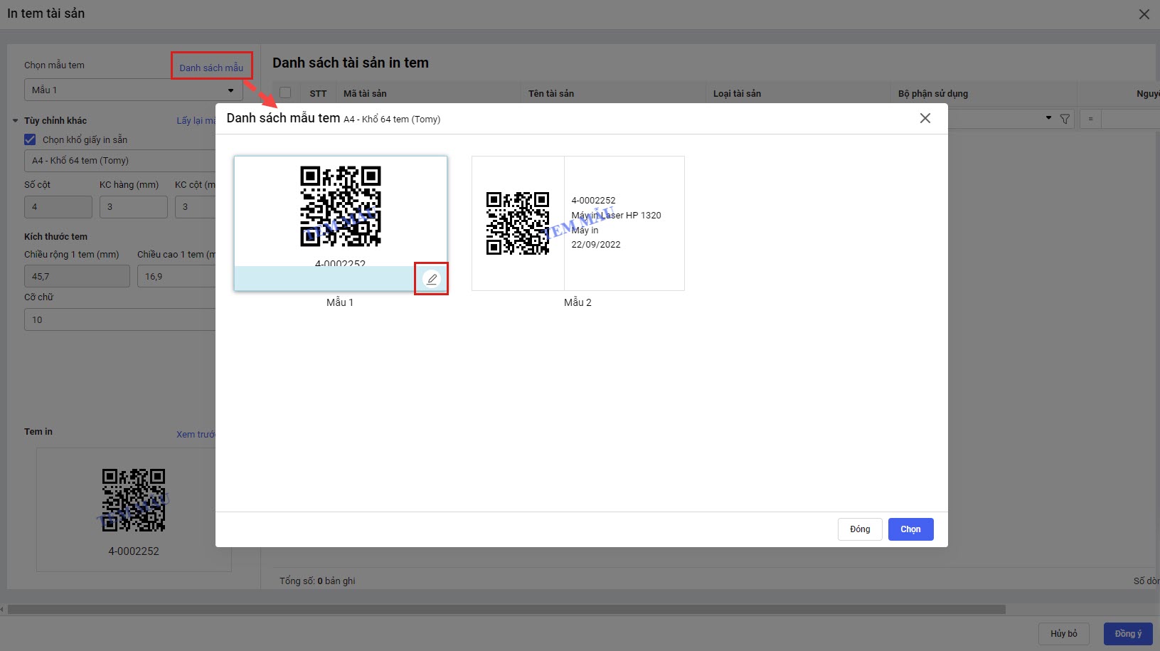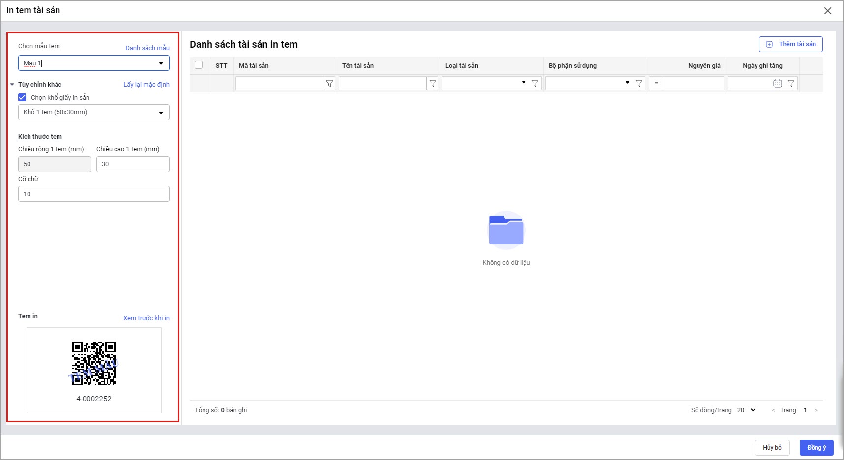 • Tại mục In tem tài sản, anh/chị tùy chọn mẫu tem; khổ giấy in; kích thước tem;…