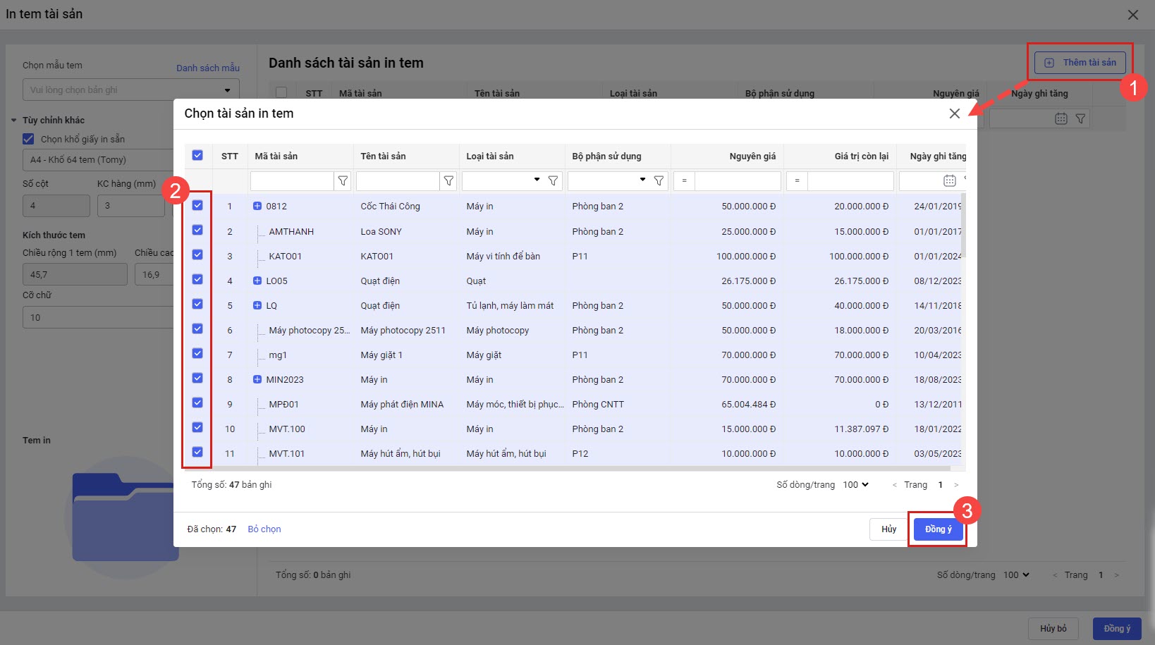 • Tại mục Danh sách tài sản in tem, nhấn Thêm tài sản, tích chọn tài sản cần in tem. Nhấn Đồng ý.