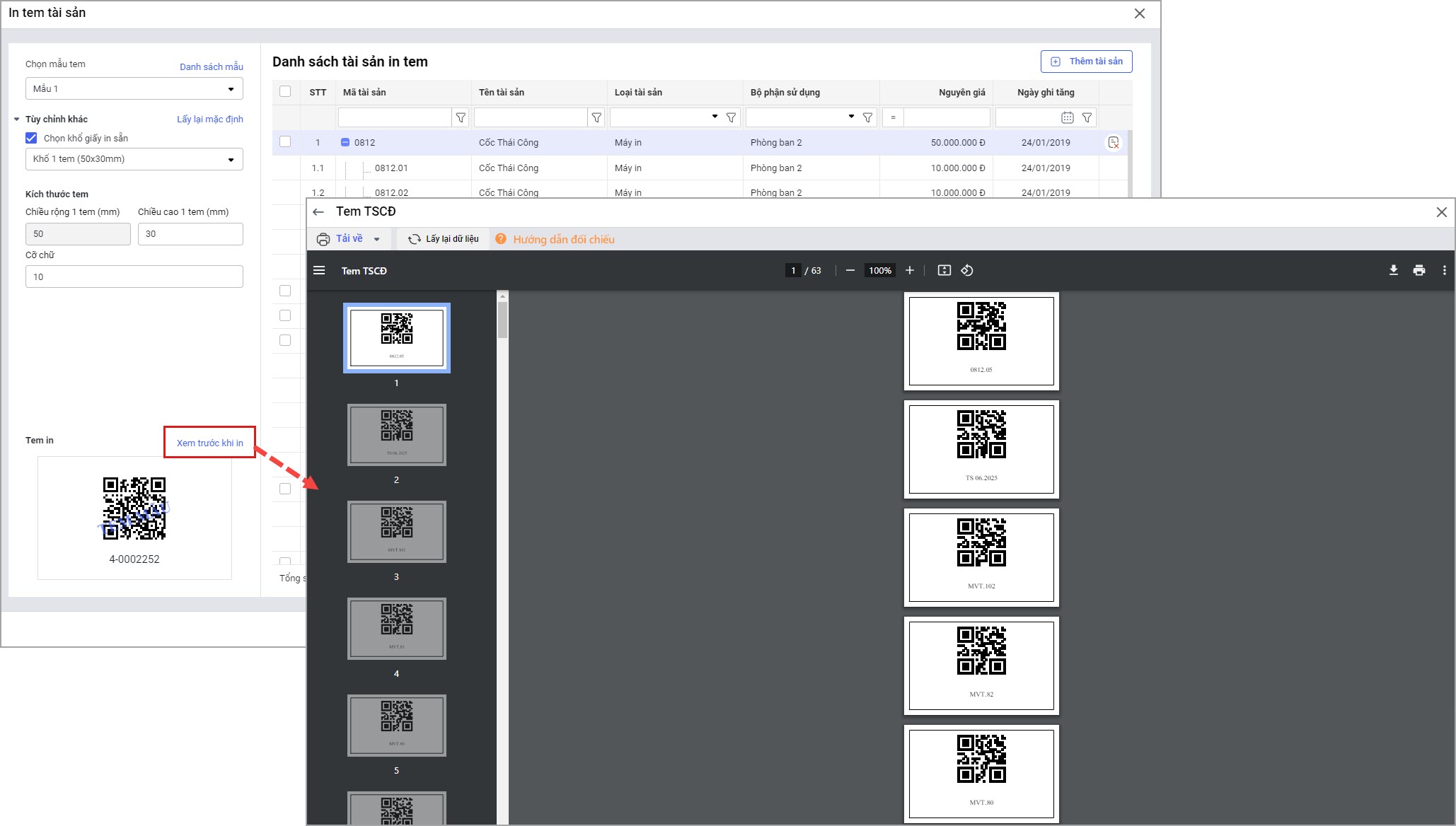 • Nhấn Xem trước khi in để xem trước tem in tài sản trước khi in hàng loạt