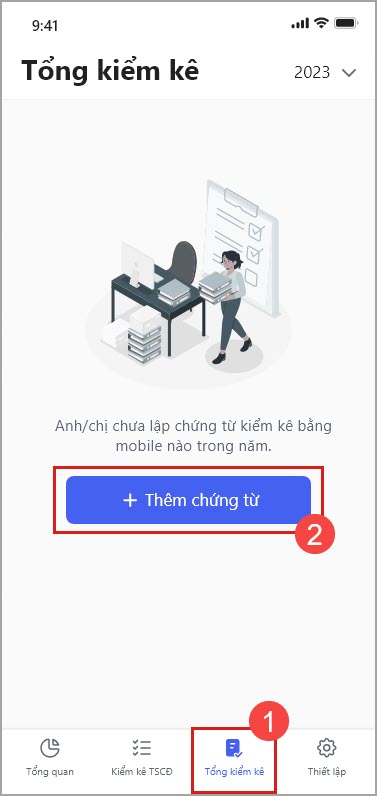 2. Sau khi đăng nhập vào app QLTS tại tab Tổng kiểm kê, anh/chị chọn menu Tổng kiểm kê\Thêm chứng từ.