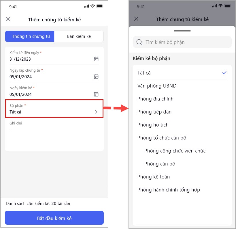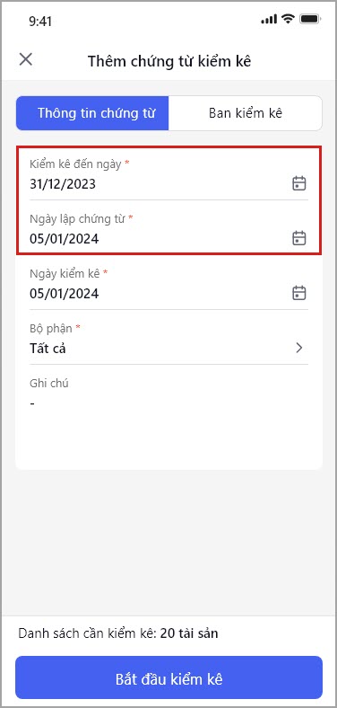 Bước 1: Thiết lập kiểm kê tài sản trên mobile
