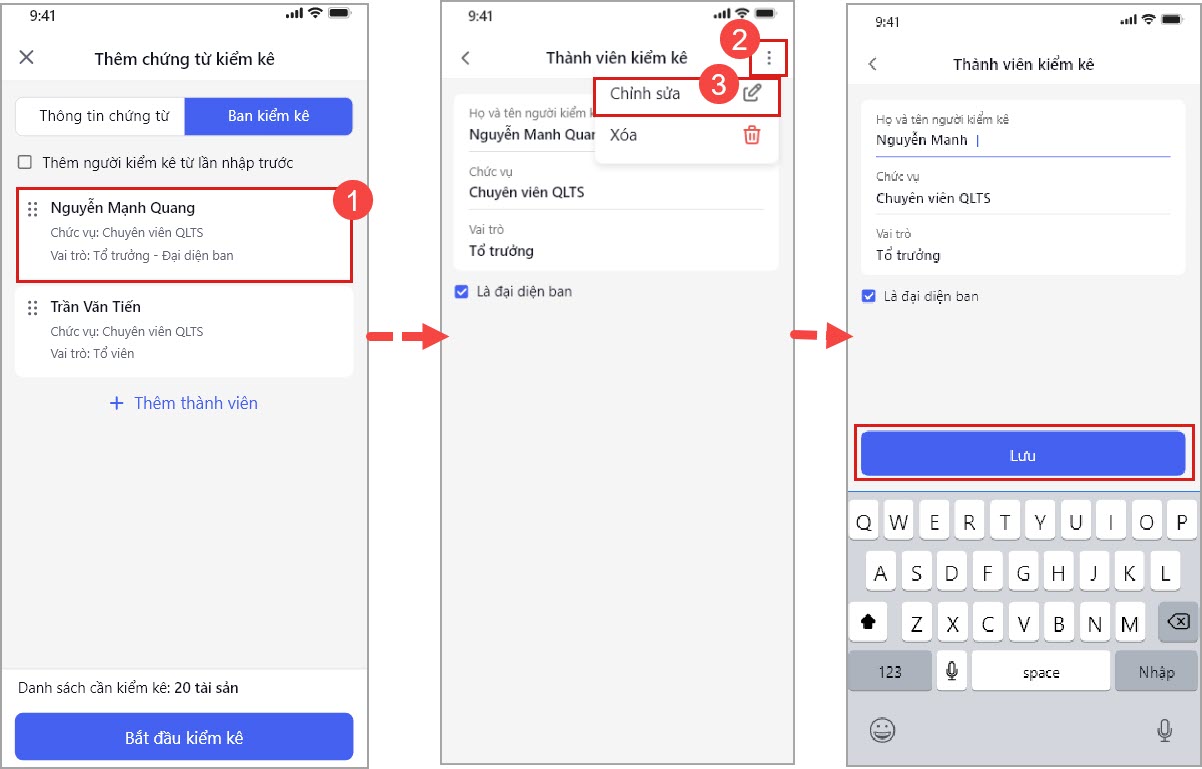 • Nhập họ tên người kiểm kê, chức vụ và vai trò người kiểm kê (nếu là đại diện ban, tích chọn Là đại diện ban), sau đó chọn Thêm.Để sửa thông tin các thành viên trong ban kiểm kê anh/chị chọn Thành viên muốn sửa, sau đó chọn biểu tượng 3 chấm, chọn Chỉnh sửa sau đó sửa thông tin thành viên kiểm kê, Nhấn Lưu để lưu thông tin đã sửa.