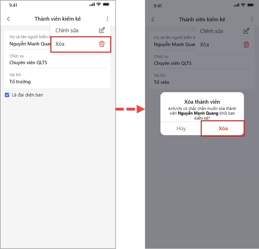 • Để xóa thông tin người kiểm kê anh/chị chọn Xóa