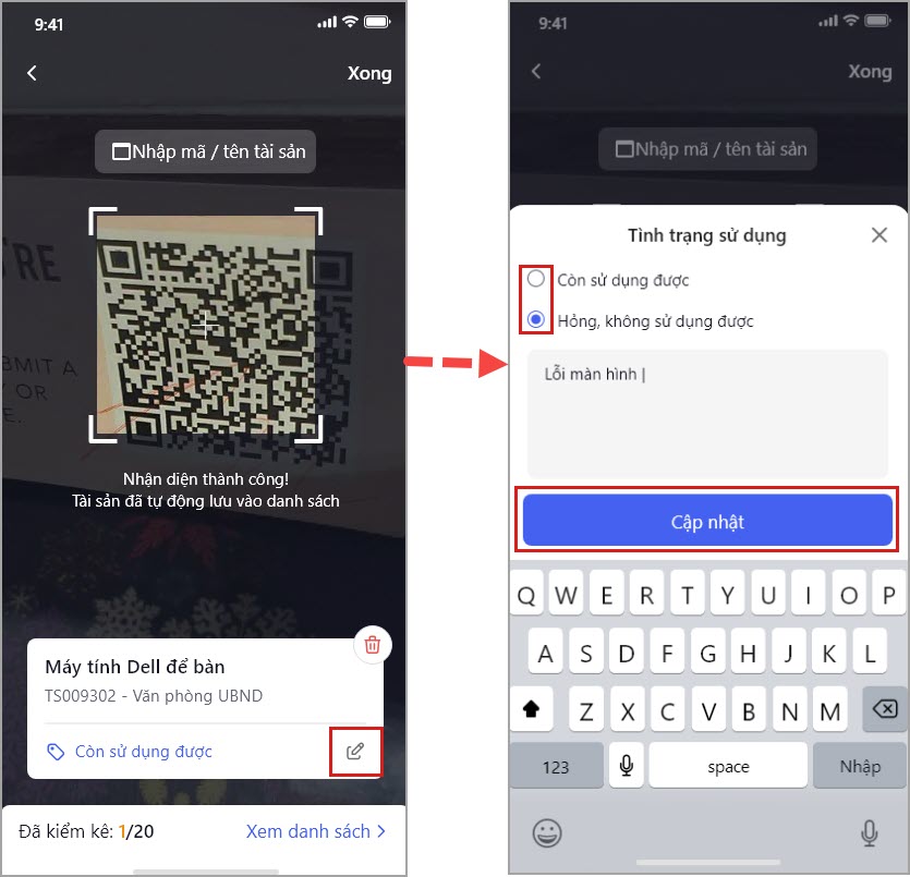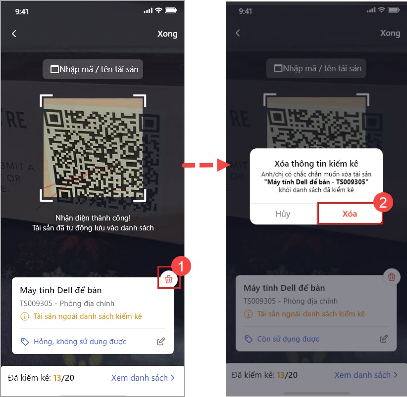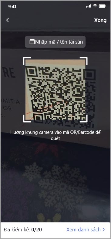 • Anh/chị bắt đầu kiểm kê tài sản bằng cách quét mã QR hoặc Bar code trên tài sản