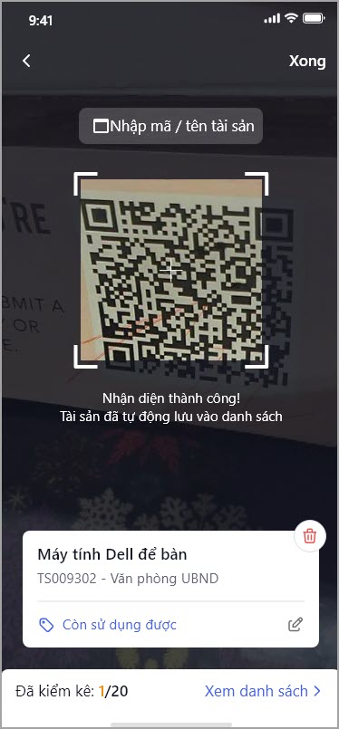 • Khi quét đúng mã code của tài sản trong bộ phận kiểm kê, phần mềm sẽ hiển thị thông tin cơ bản của tài sản.
