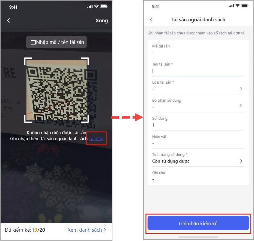• Trường hợp quét mã tài sản nhưng không có thông tin tài sản trong danh sách tài sản, anh/chị chọn Tại đây để khai báo thông tin tài sản, khai báo thông tin, sau đó chọn Ghi nhận kiểm kê.
