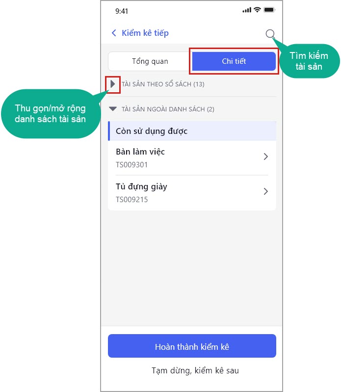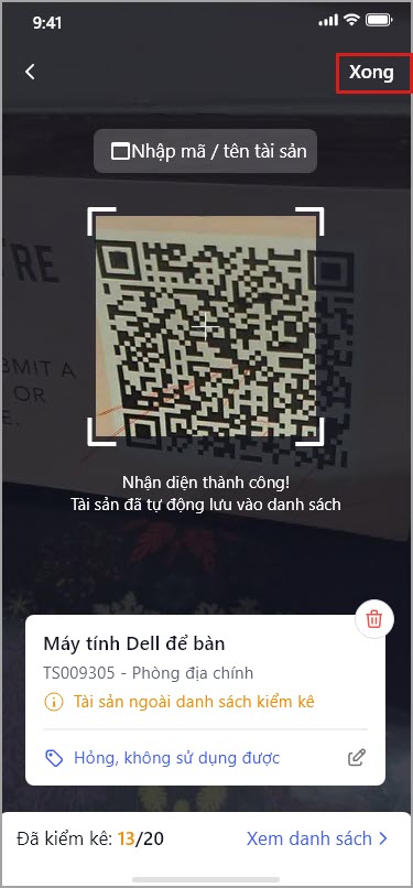 • Các tài sản được kiểm kê sẽ tự động thêm vào danh sách Đã kiểm kê và lưu lại vào máy của người dùng.