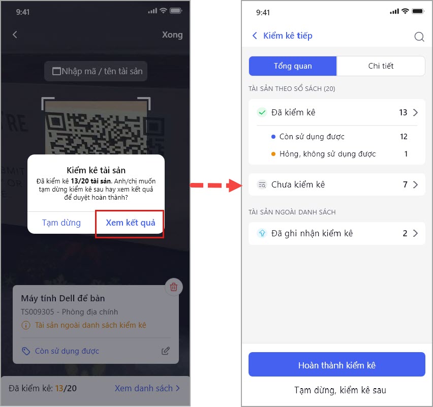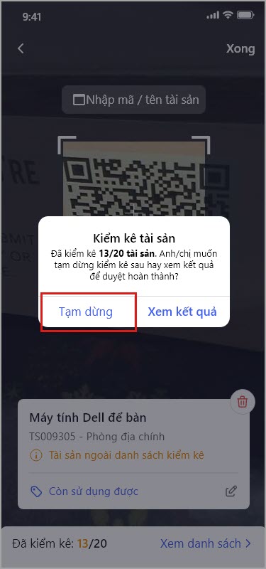 • Nếu muốn tạm dừng kiểm kê và để thực hiện kiểm kê tiếp anh/chị chọn chứng từ, phần mềm sẽ tự động quét mã tài sản.