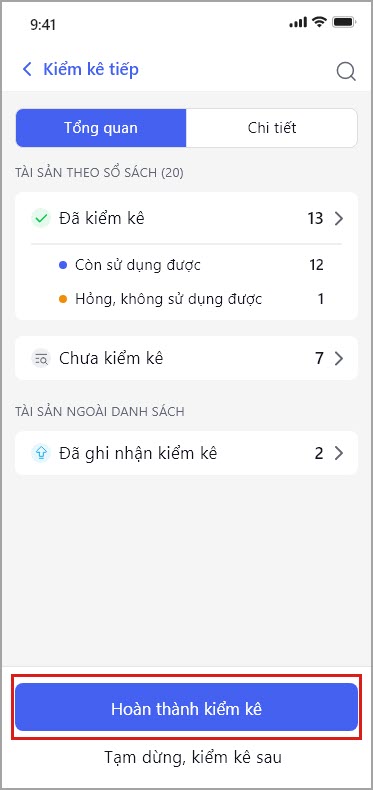 • Để hoàn thành kiểm kê anh/chị chọn Hoàn thành kiểm kê.