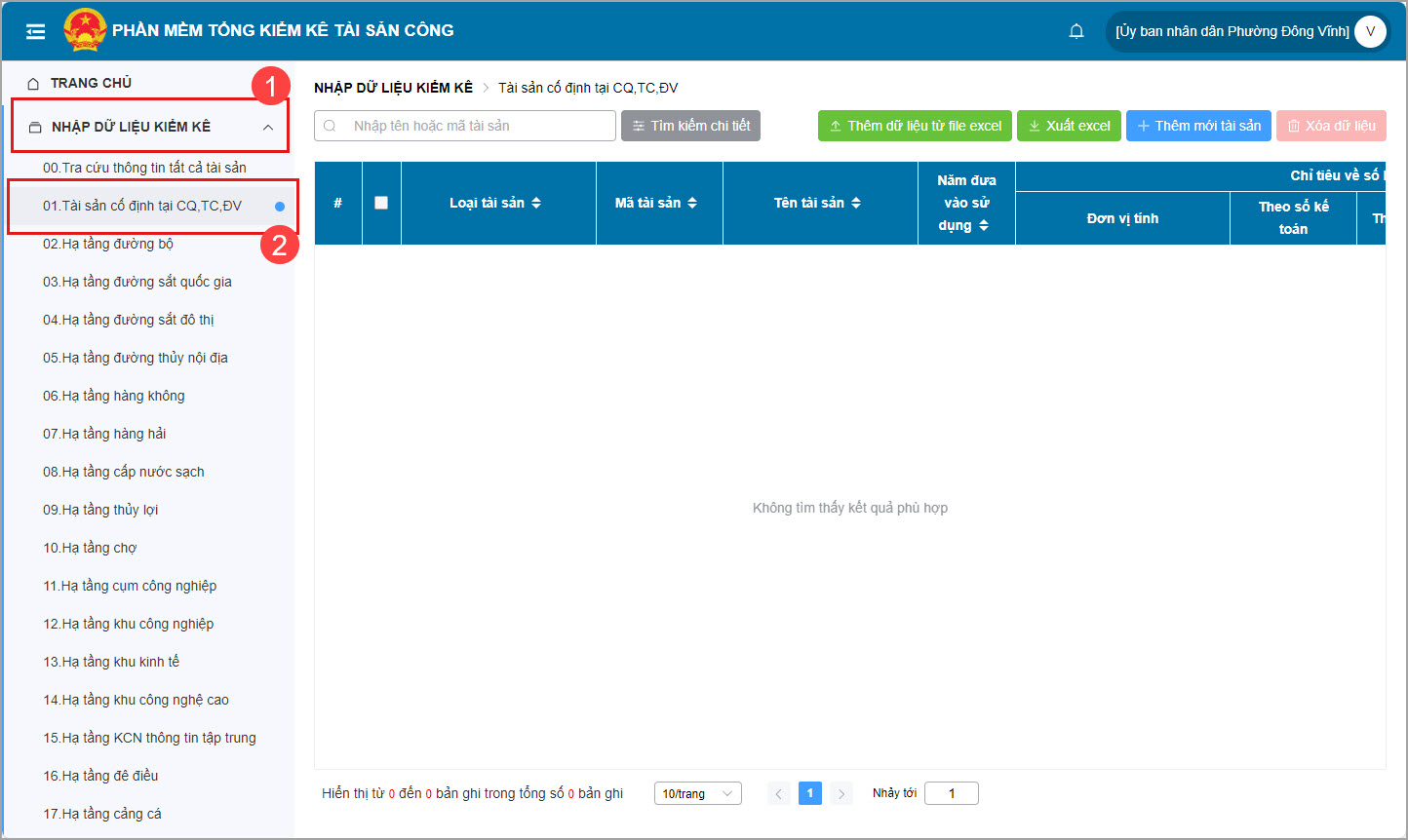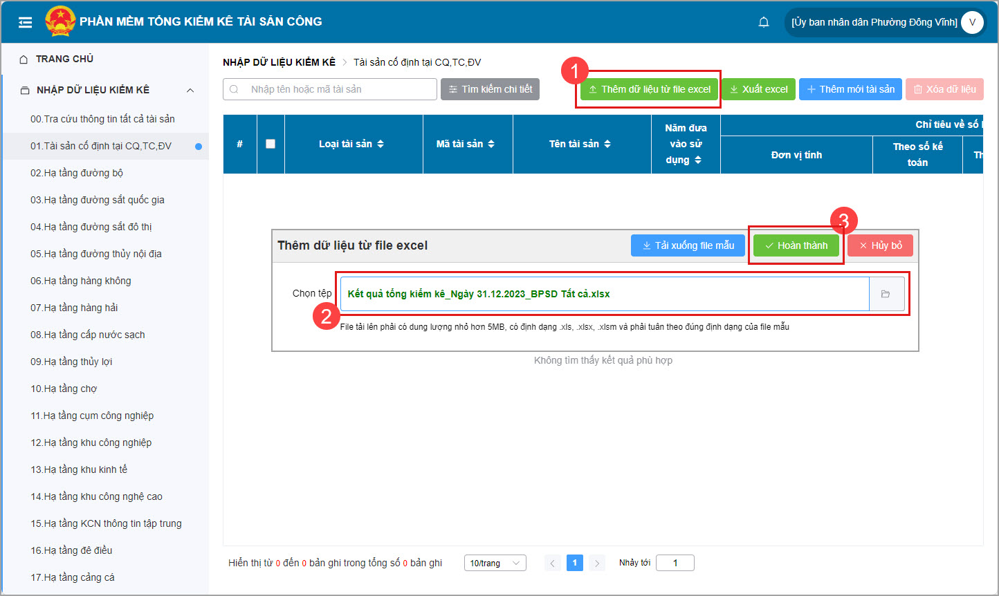 • Chọn Thêm dữ liệu từ file excel, sau đó tải file mà cán bộ QLTS mới tải về, chọn Hoàn thành