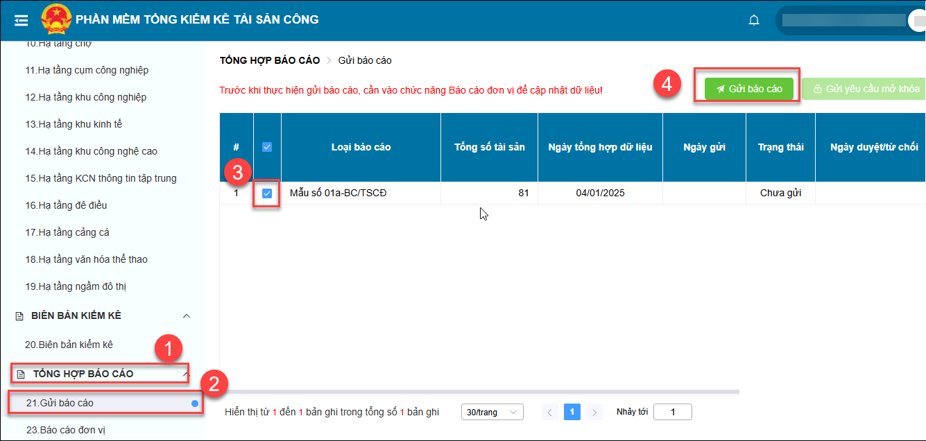 Bước 10: Gửi báo cáo lên cấp trên ở phần mềm Tổng kiểm kê TSC