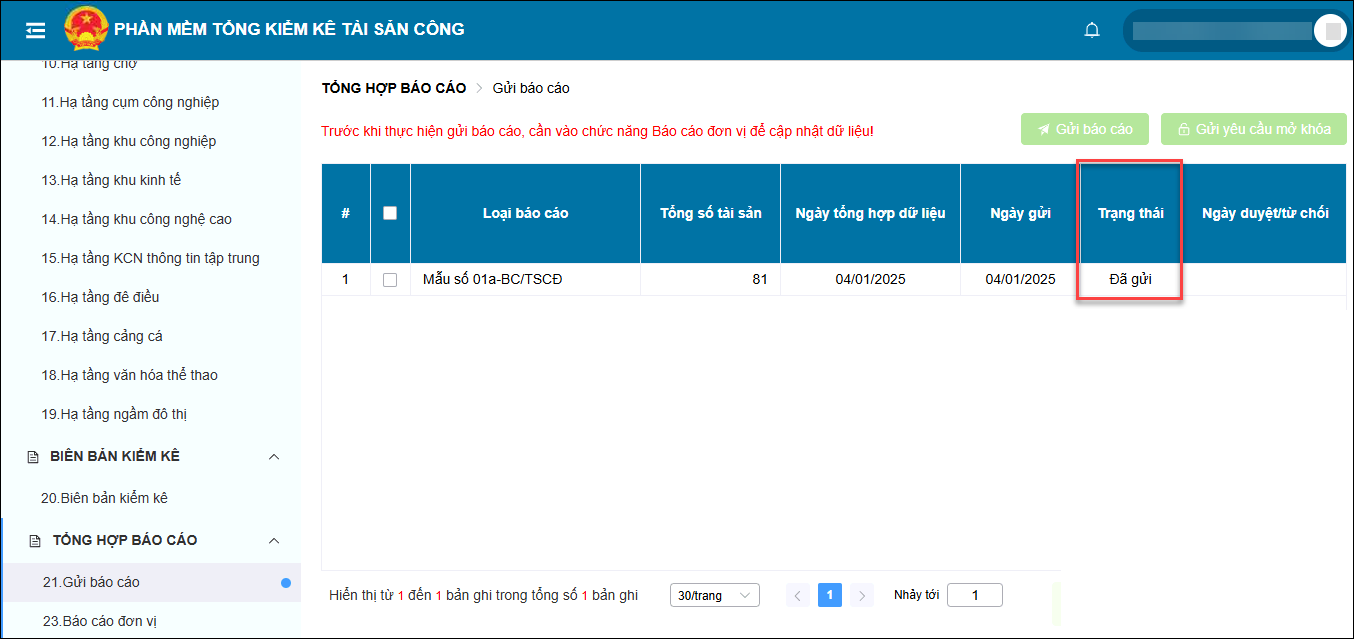 • Sau khi thực hiện gửi báo cáo, cột Trạng thái sẽ trở thành Đã gửi.
