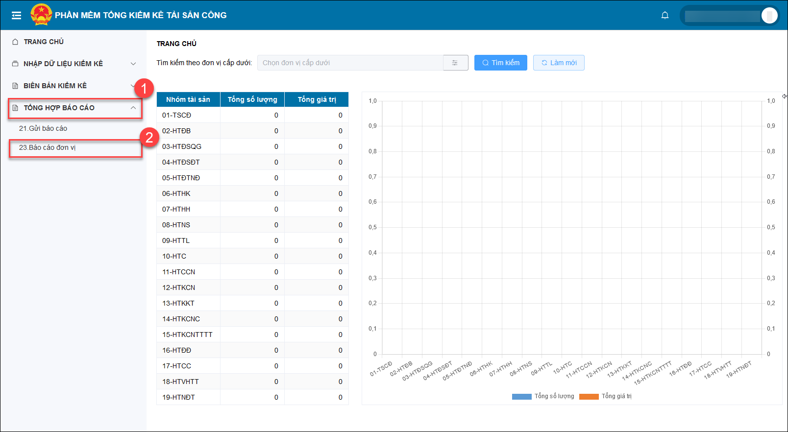 • Tại menu thanh công cụ bên trái, nhấn chọn TỔNG HỢP BÁO CÁO, chọn 23.Báo cáo đơn vị