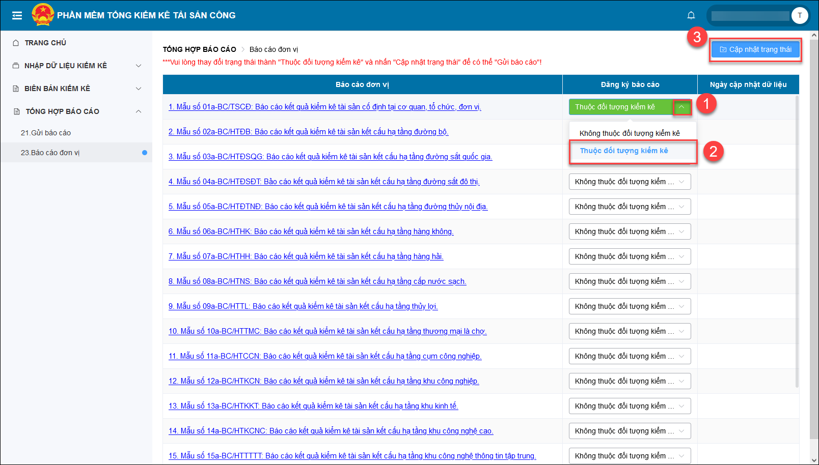 • Đăng ký các mẫu báo cáo đơn vị cần nộp cấp trên: Tại dòng mẫu báo cáo đơn vị cần nộp, chọn mũi tên, chọn Thuộc đối tượng kiểm kê và nhấn Cập nhật trạng thái.
