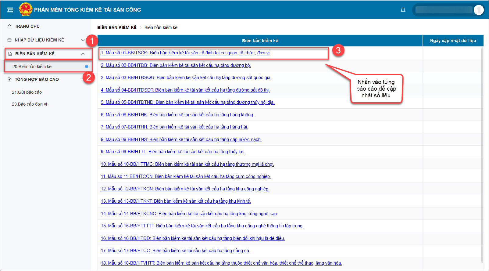 • Tại menu thanh công cụ bên trái, nhấn chọn BIÊN BẢN KIỂM KÊ, chọn 20. Biên bản kiểm kê, nhấn đúp (2 lần) vào dòng báo cáo để cập nhật số liệu.