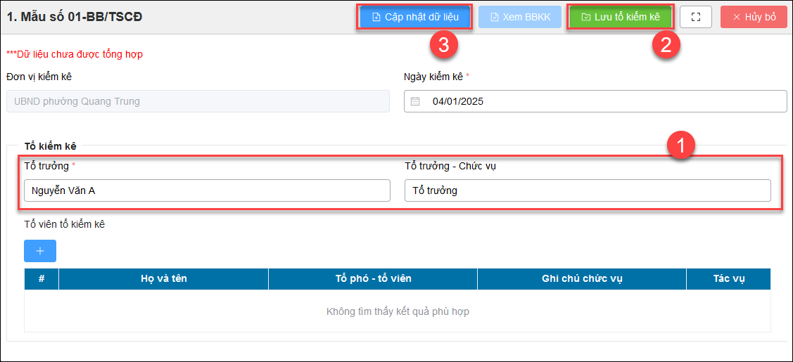 • Điền thông tin ban kiểm kê, nhấn Lưu tổ kiểm kêCập nhật dữ liệu.