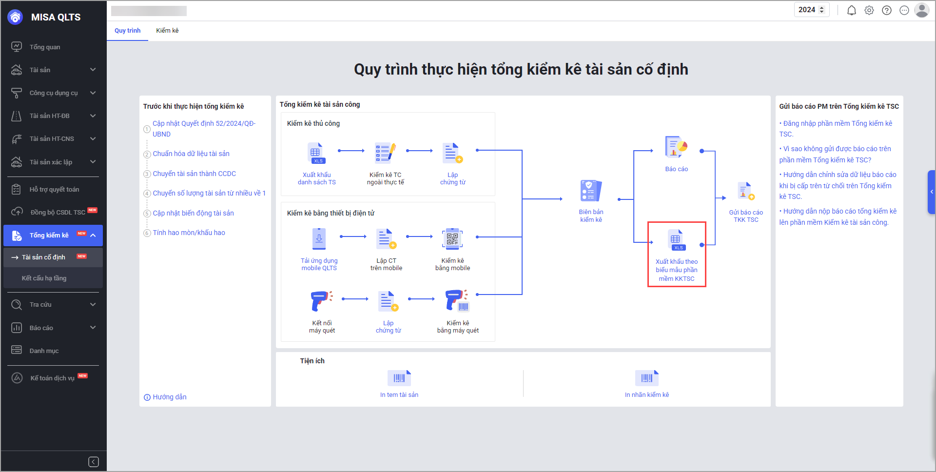 • Tại menu Tổng kiểm kê\Tài sản cố định: tại tab Quy trình, chọn Báo cáo, chọn mẫu Xuất khẩu theo biểu mẫu phần mềm KKTSC.