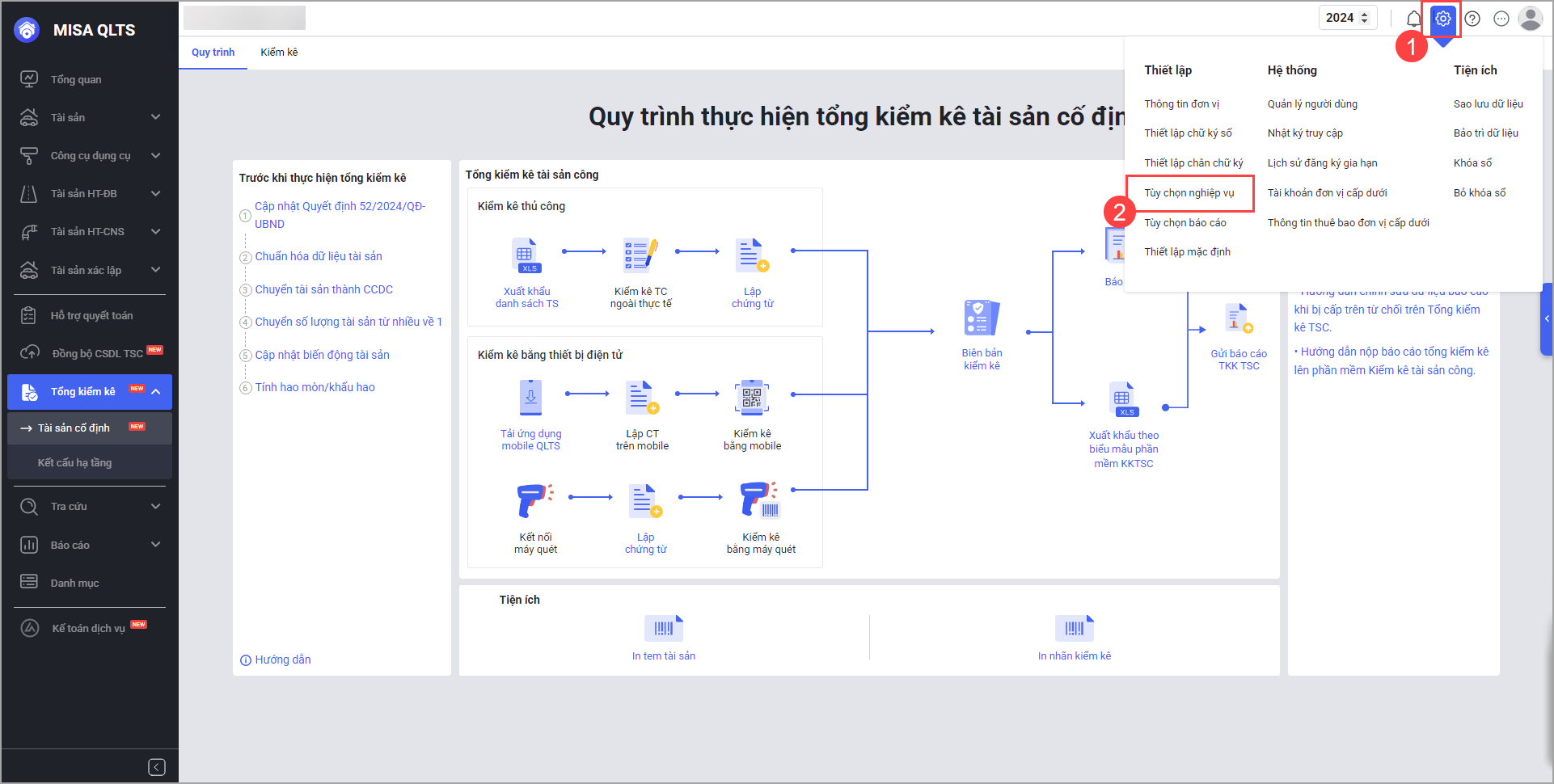 Để kiểm kê bằng mobile, trước hết anh/chị cần thiết lập nghiệp vụ và in tem gắn mã cho từng tài sản: