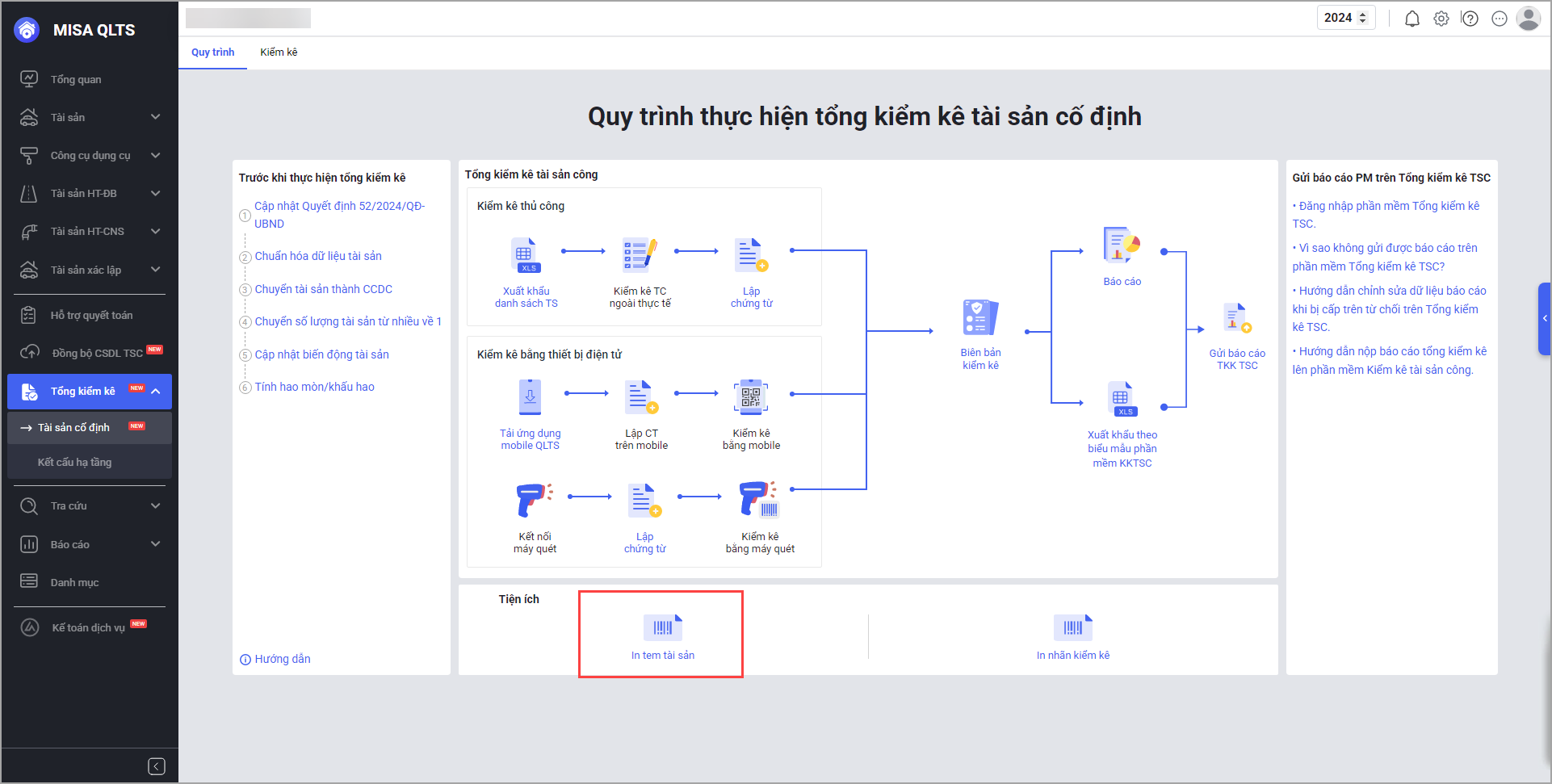 1. Tại menu Tổng kiểm kê\Tài sản cố định: tại tab Quy trình, chọn In tem tài sản.