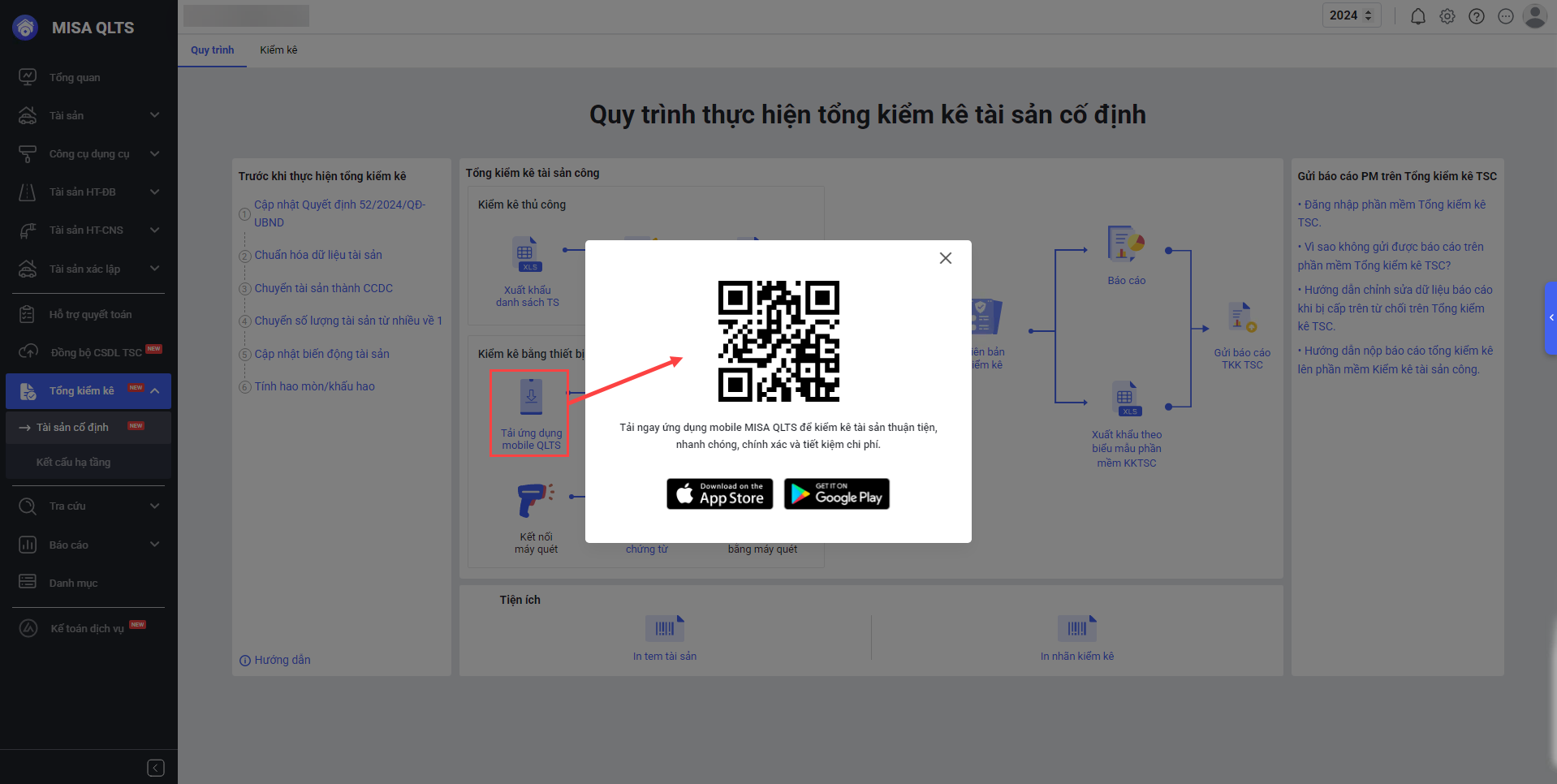 1. Anh/chị quét mã QR sau đó tải ứng dụng MISA QLTS, đăng nhập vào app QLTS bằng tài khoản đăng nhập trên web.