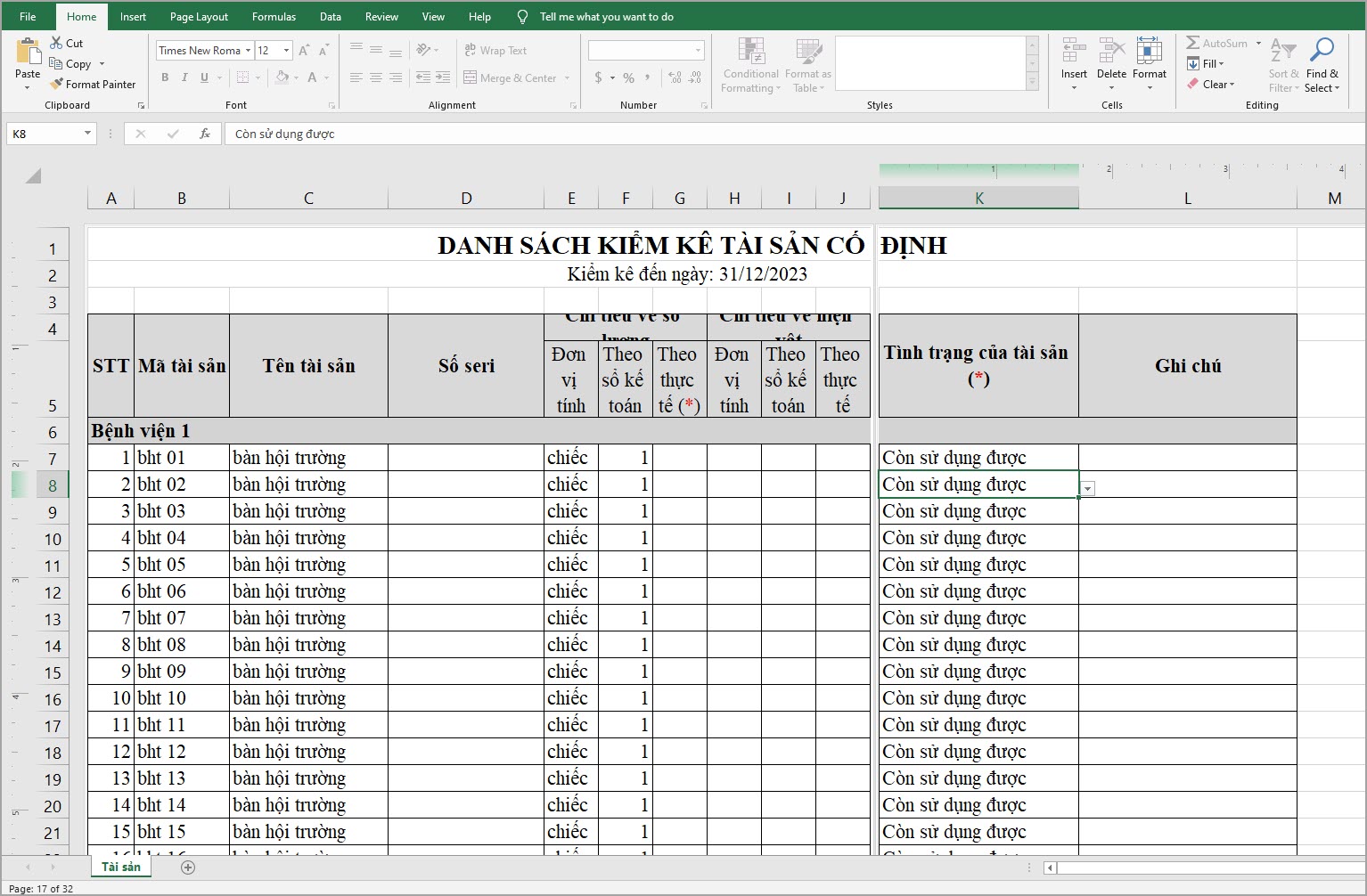 - Sau khi tải danh sách tài sản cần kiểm kê về anh/chị tiến hành kiểm kê tài sản tại đơn vị.