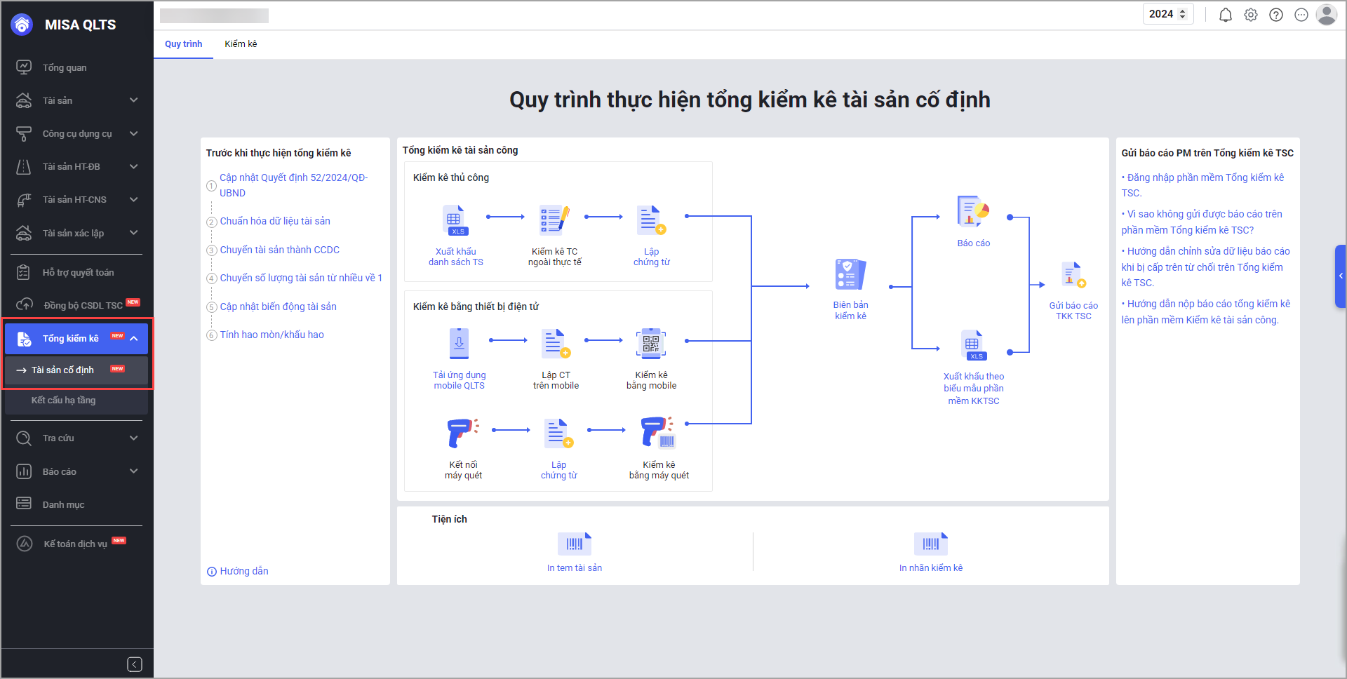 Bài viết này giúp anh/chị nắm được các bước tổng kiểm kê tài sản cố định tại đơn vị trên phần mềm QLTS, đảm bảo dữ liệu chính xác, đầy đủ để đồng bộ dữ liệu lên phần mềm Tổng kiểm kê tài sản công của Bộ tài chính và in, gửi báo cáo lên cấp trên.