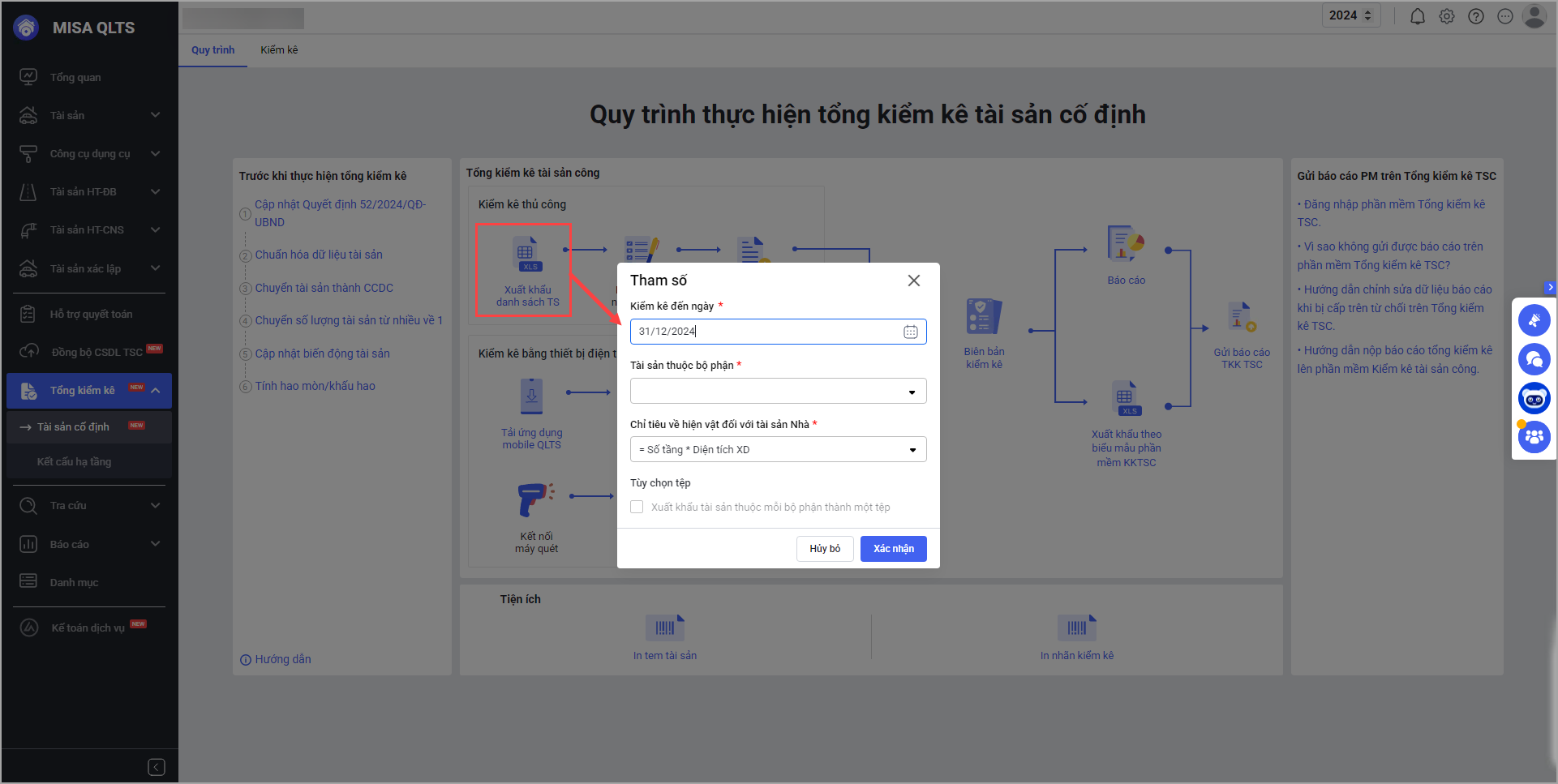 - Tại tab Quy trình\Xuất khẩu danh sách tài sản để tải danh sách tài sản đang sử dụng tại đơn vị, chọn Tham số để xuất khẩu Danh sách tài sản cần thực hiện tổng kiểm kê