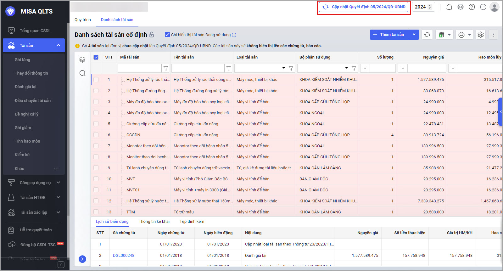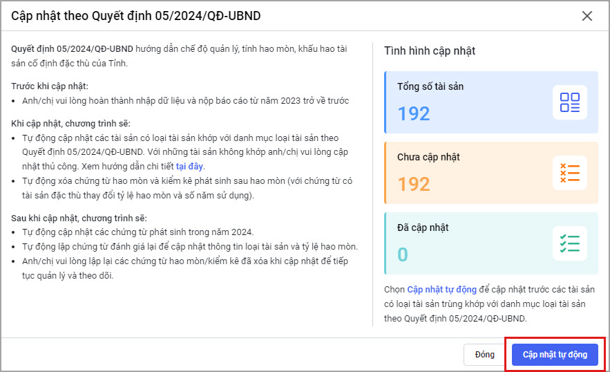 • Hoặc tại màn hình Danh sách tài sản cố định chọn Cập nhật quyết định số 05/2024/QĐ-UBND.