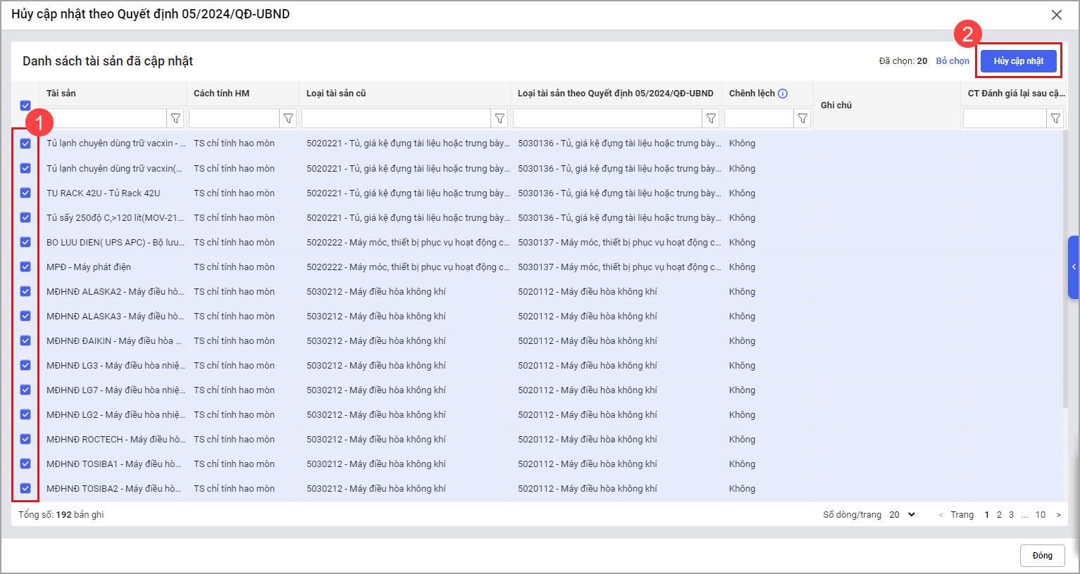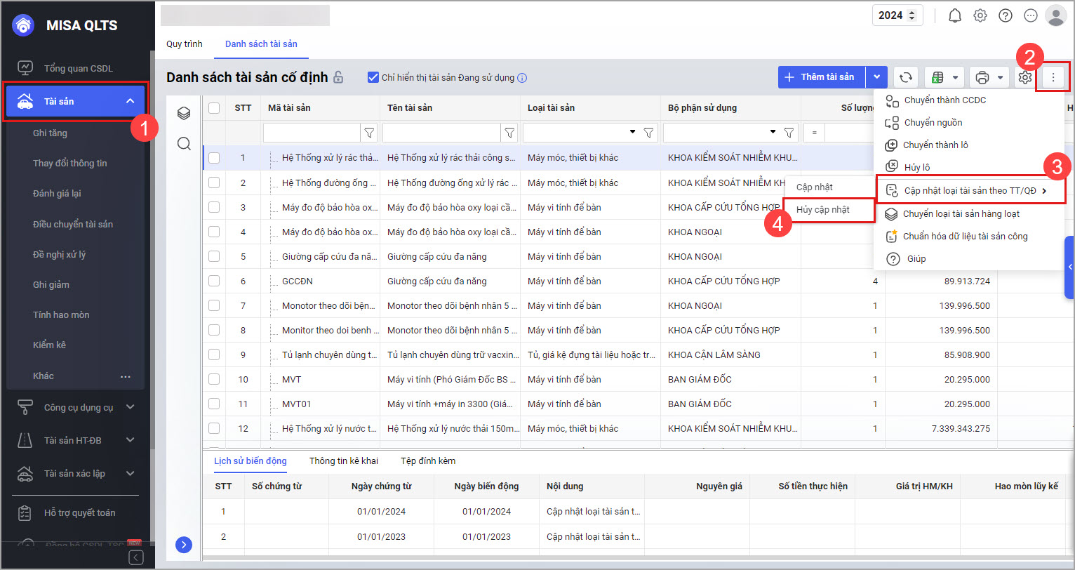 Trong trường hợp thực hiện cập nhật tài sản theo Quyết định số 05/2024/QĐ-UBND có sai sót (sai loại tài sản hoặc cần tính lại hao mòn của năm cũ), tính năng Hủy bỏ chuyển loại tài sản sẽ giúp lấy lại thông tin của tài sản tại thời điểm trước khi cập nhật.