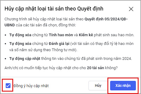 Tích chọn Đồng ý cập nhật và nhấn Xác nhận để đồng ý cập nhật tài sản theo thông tư mới.