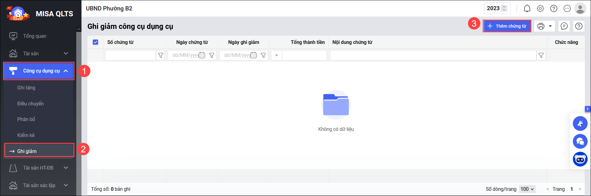 Bước 1: Thêm chứng từ ghi giảm CCDC
