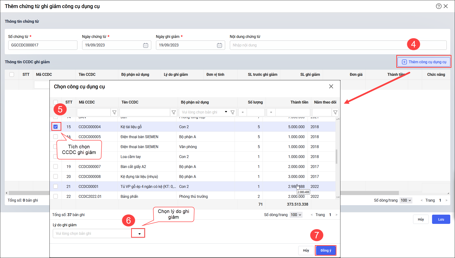 • Nhấn Thêm công cụ dụng cụ và tích chọn những CCDC cần ghi giảm (chọn được nhiều CCDC).