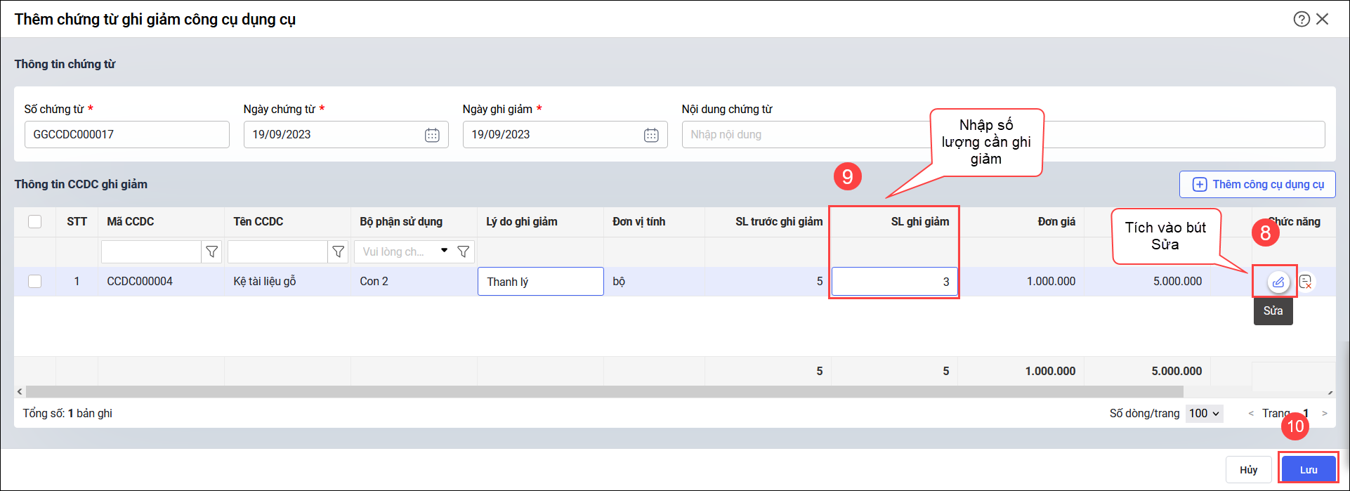 • Nhấn vào biểu tượng hình bút Sửa ở cuối dòng để chỉnh sửa lại số lượng ghi giảm tại cột SL ghi giảm.