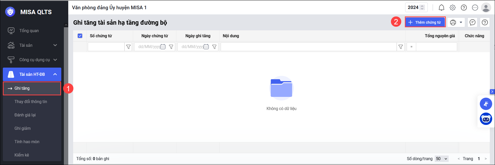 Bước 2: Nhấn Thêm chứng từ để lập chứng từ ghi tăng tài sản.