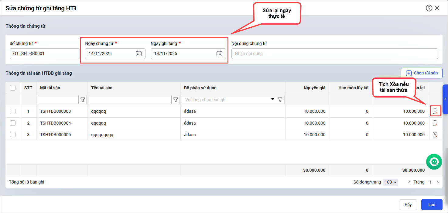 - Nếu muốn xóa tài sản khỏi chứng từ ghi tăng thì nhấn vào biểu tượng Xóa (dấu x cuối dòng tài sản).