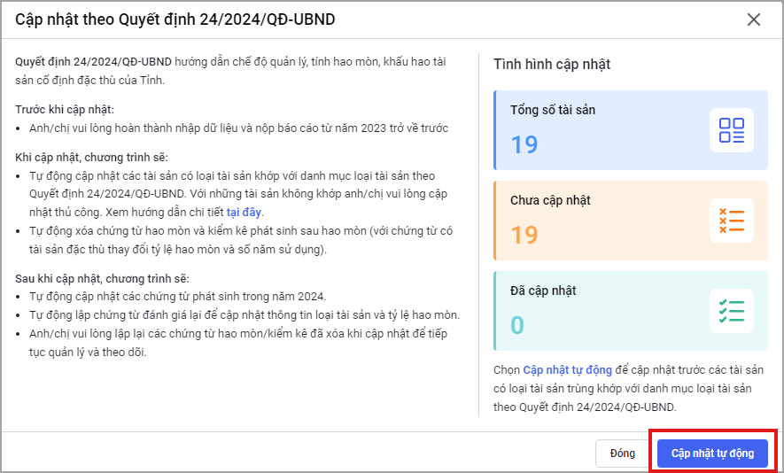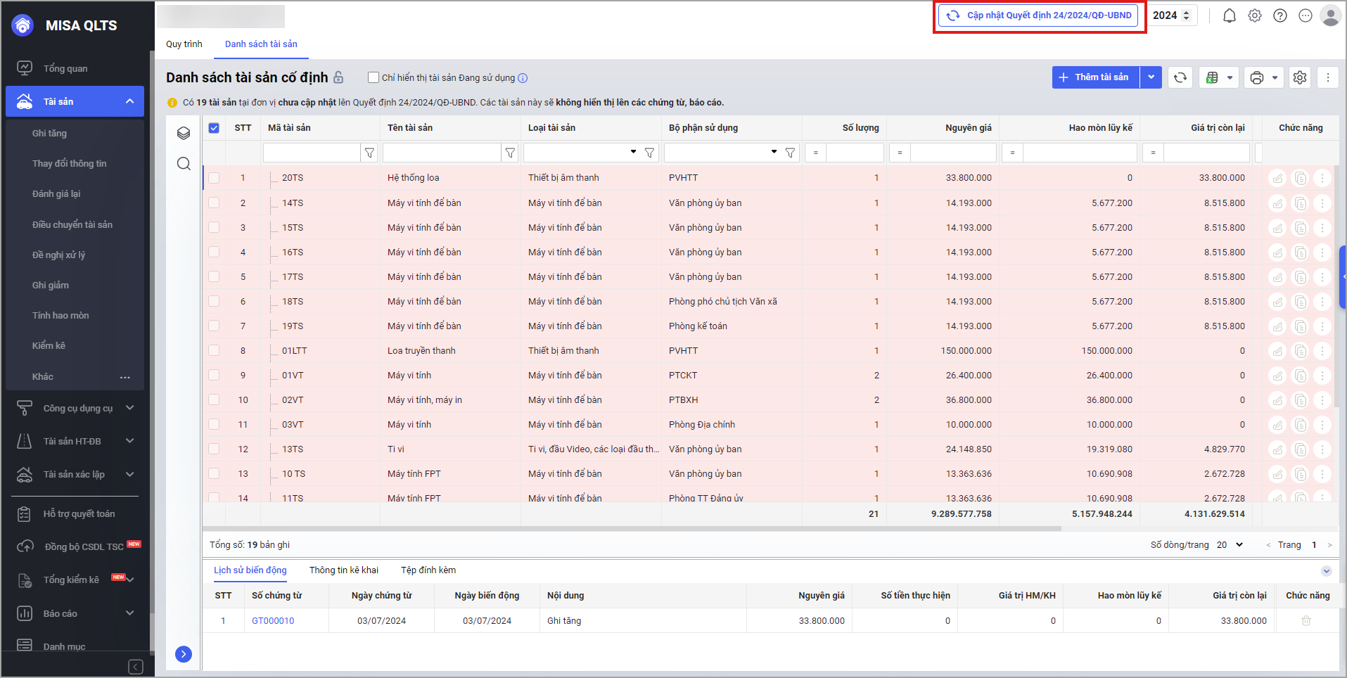 - Hoặc tại màn hình Danh sách tài sản cố định chọn Cập nhật quyết định số 24/2024/QĐ – UBND.