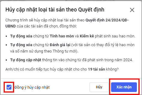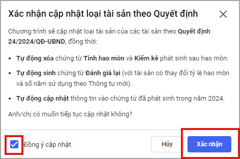 - Tích chọn Đồng ý cập nhật và chọn Xác nhận để đồng ý cập nhật tải sản theo thông tư mới.