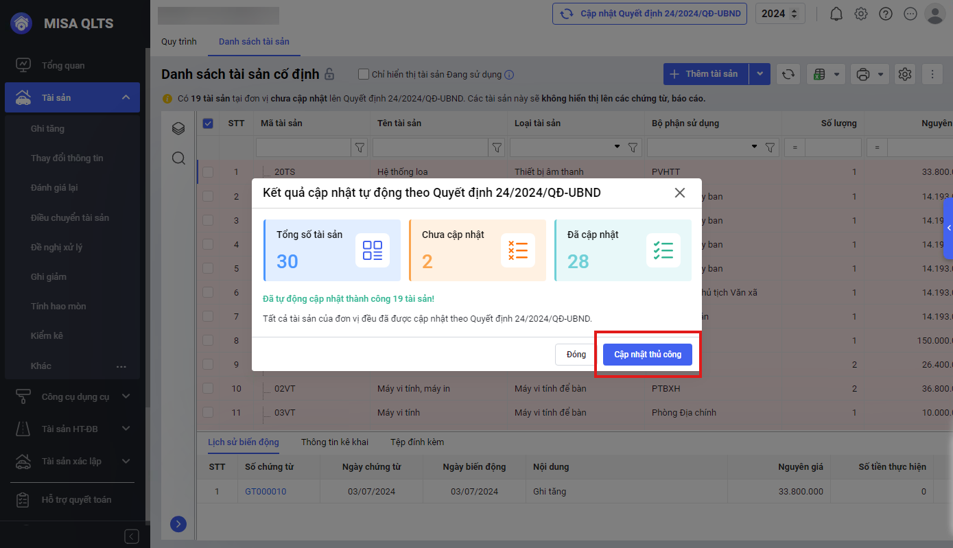 - Với các tài sản chưa được cập nhật anh/chị có thể cập nhật thủ công bằng cách chọn Cập nhật thủ công anh/chị xem hướng dẫn Cập nhật thủ công tương tự tại đây.
