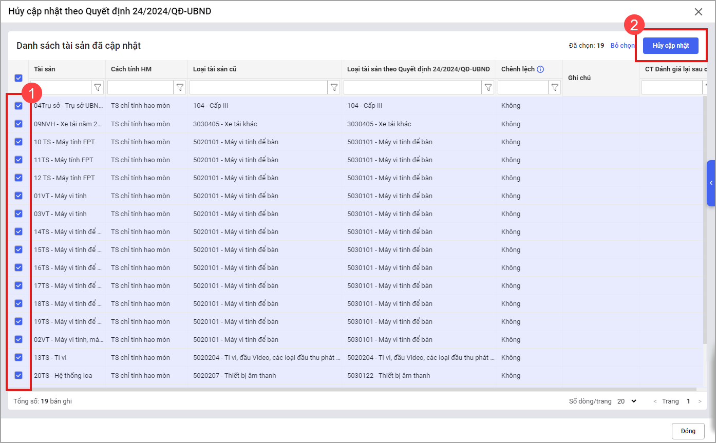 Bước 2: Phần mềm sẽ hiển thị lên danh sách hủy chuyển đổi. Tích chọn tài sản và nhấn Hủy cập nhật.