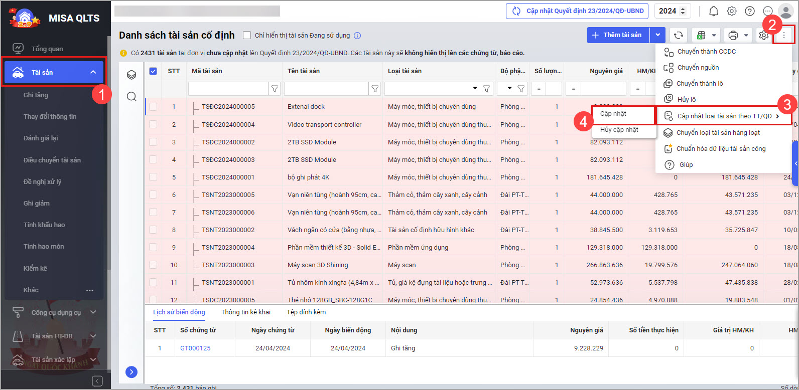 - Tại màn hình Danh sách tài sản cố định nhấn vào biểu tượng dấu ba chấm phía trên góc bên phải, chọn Cập nhật loại tài sản theo TT/QĐ, sau đó chọn Cập nhật để cập nhật Quyết định số 23/2024/QĐ-UBND.