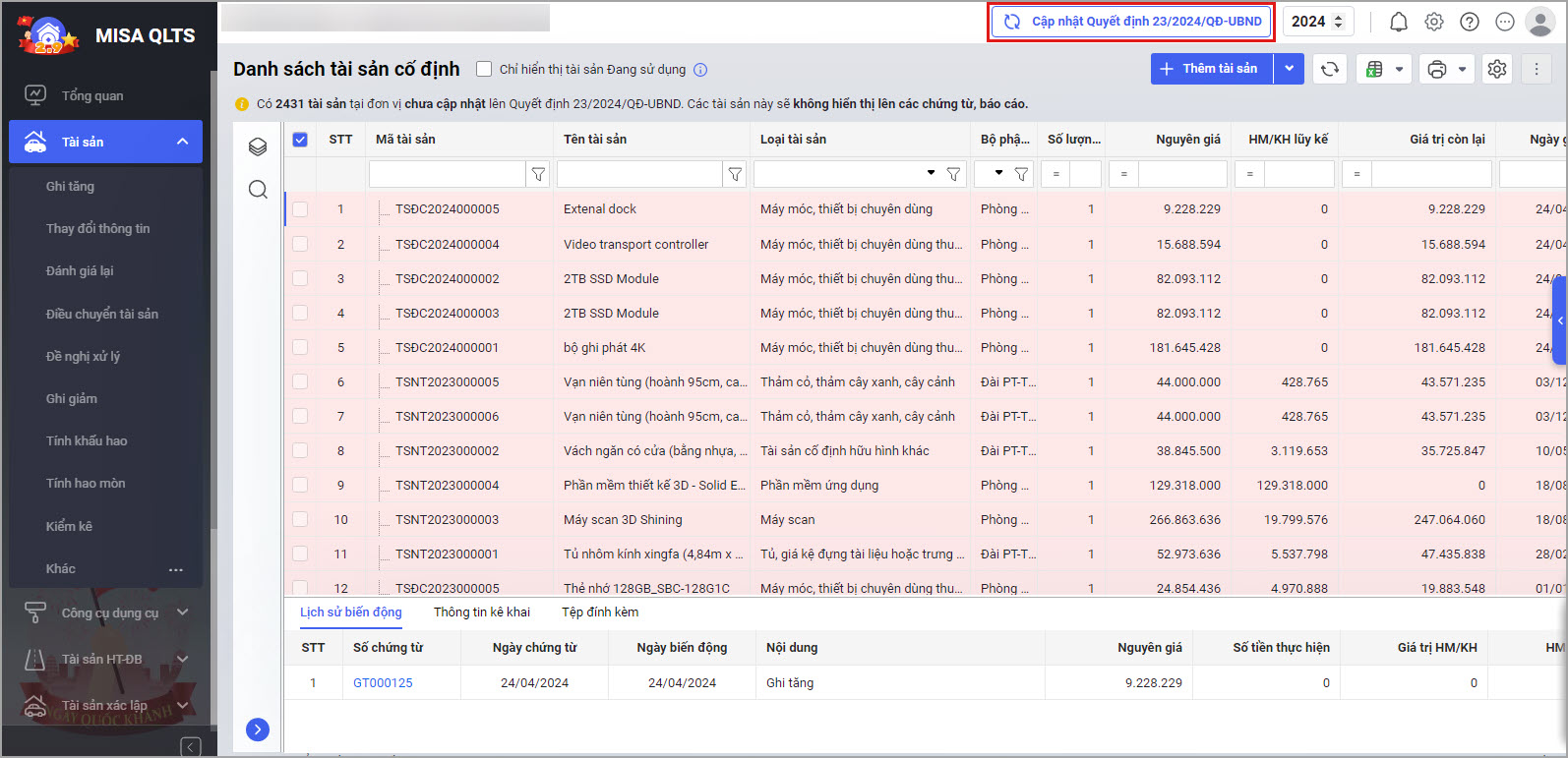 - Hoặc tại màn hình Danh sách tài sản cố định chọn Cập nhật Quyết định số 23/2024/QĐ-UBND.
