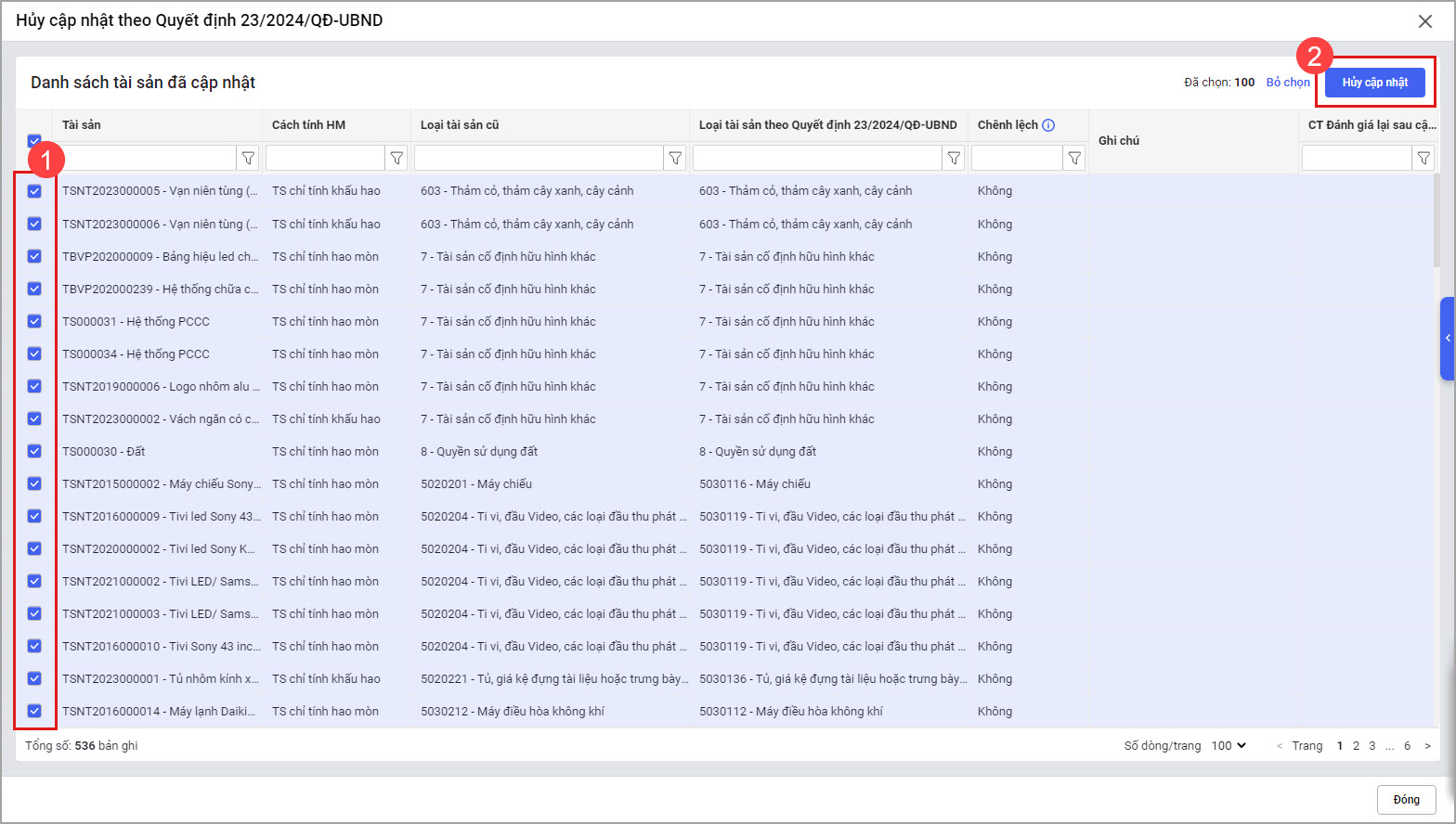 Trong trường hợp thực hiện cập nhật tài sản theo Quyết định số 23/2024/QĐ-UBND có sai sót (sai loại tài sản hoặc cần tính lại hao mòn của năm cũ), tính năng Hủy bỏ chuyển loại tài sản sẽ giúp lấy lại thông tin của tài sản tại thời điểm trước khi cập nhật.