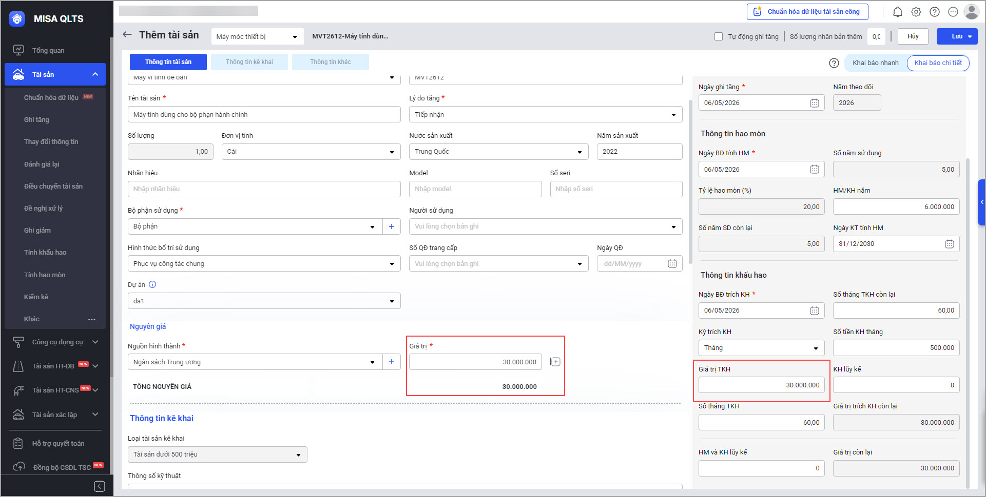 4. Hỗ trợ cảnh báo để khai báo đúng giá trị trích khấu hao phù hợp với cách tính hao mòn/khấu hao của tài sản