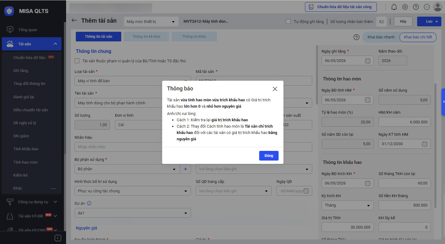 Hỗ trợ cảnh báo để khai báo đúng giá trị trích khấu hao phù hợp với cách tính hao mòn/khấu hao của tài sản