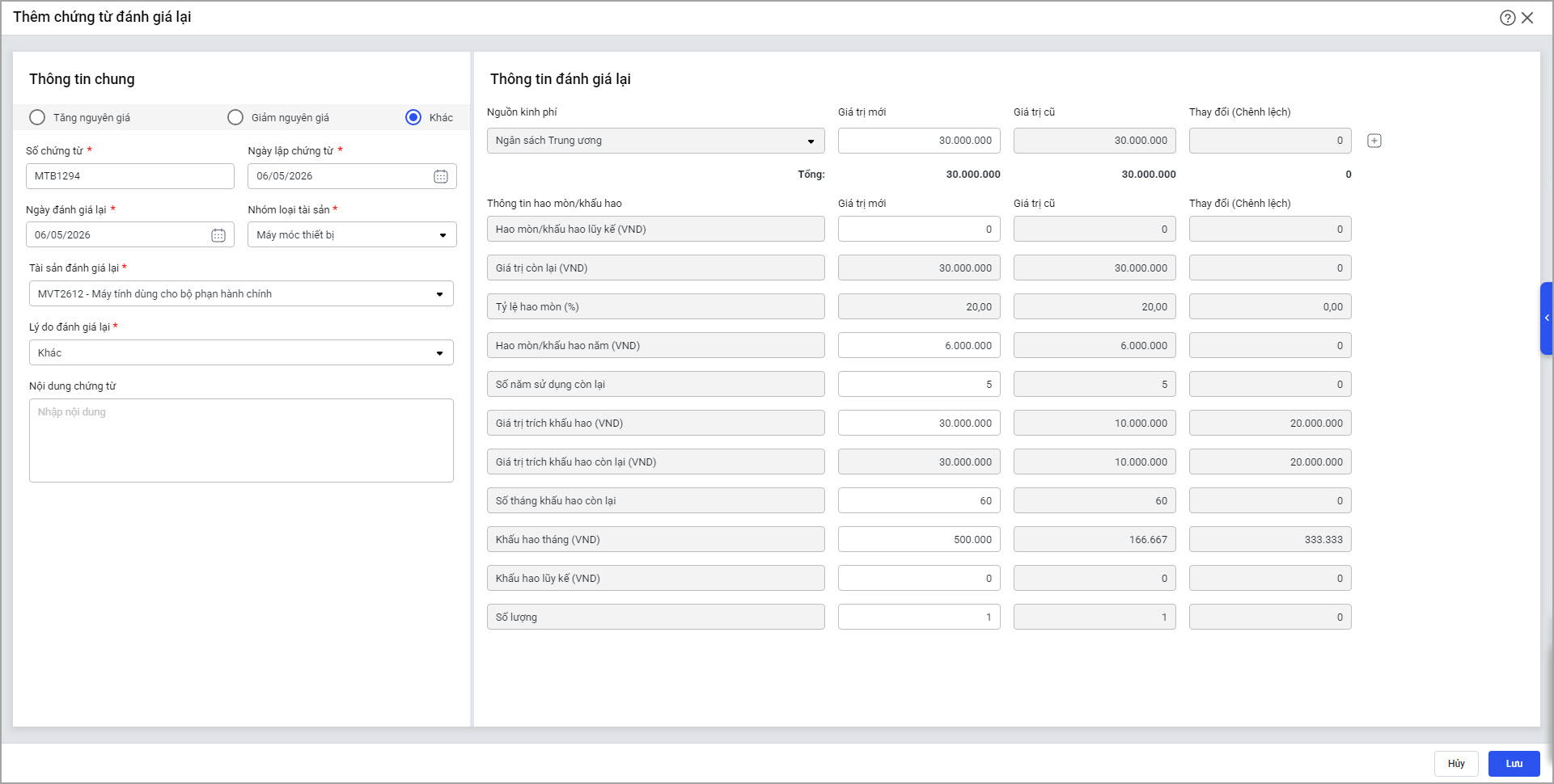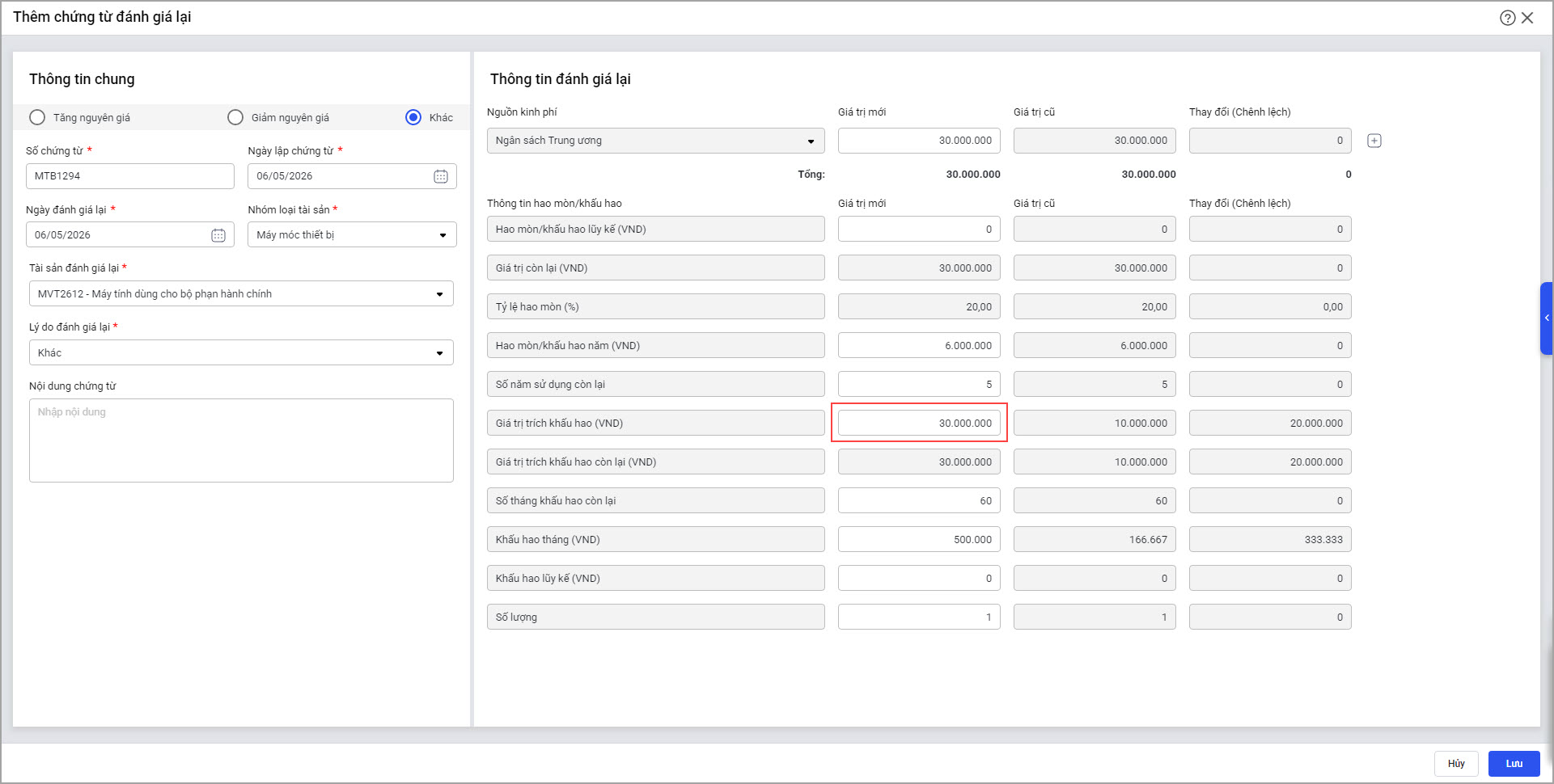 • Tại màn hình Đánh giá lại, đối với tài sản có Cách tính hao mòn là Tài sản vừa tính hao mòn vừa trích khấu hao.