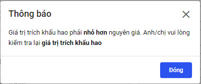 • Khi khai báo Giá trị Tính khấu hao lớn hơn hoặc bằng nguyên giá thì phần mềm hiển thị cảnh báo.